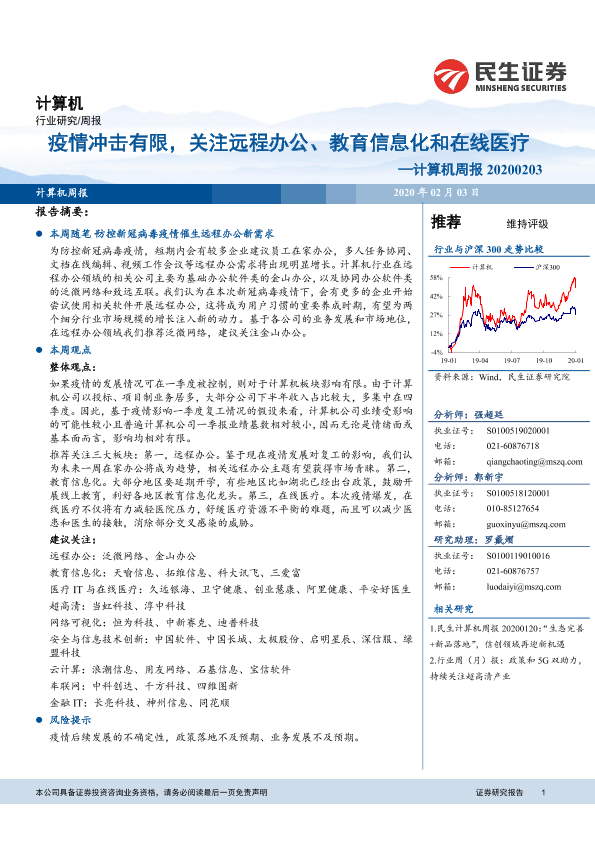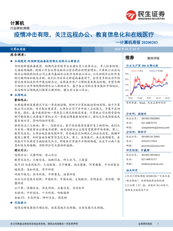 【民生证券】【20200203】20200203-民生证券-计算机周报:疫情冲击有限,关注远程办公、教育信息化和在线医疗-16页