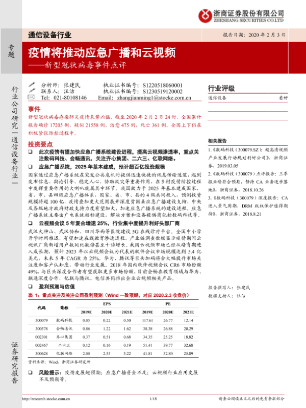 【浙商证券】【20200203】通信设备行业新型冠状病毒事件点评:疫情将推动应急广播和云视频-18页