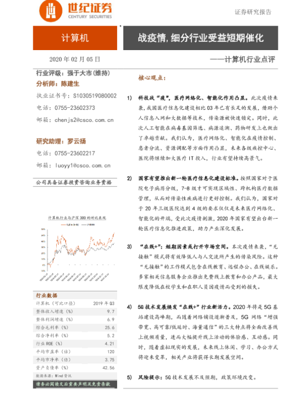 【世纪证券】【20200205】计算机行业点评:战疫情,细分行业受益短期催化-10页
