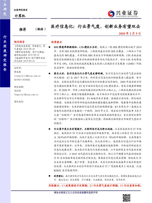【兴业证券】【20200205】医疗信息化:行业景气度、创新业务有望双击-31页