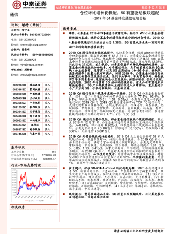 【中泰证券】【20200208】2019年Q4基金持仓通信板块分析:仓位环比增长仍低配,5G有望驱动板块超配-16页