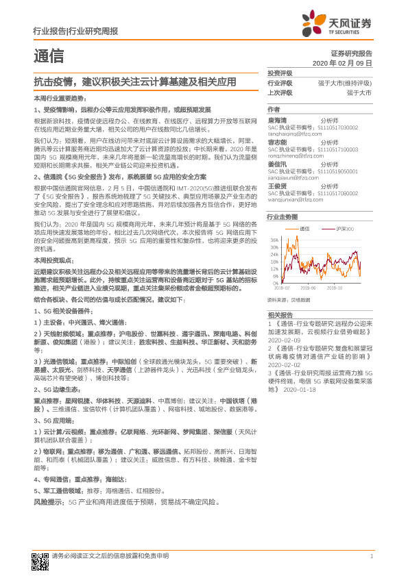 【天风证券】【20200209】20200209-天风证券-通信行业周报:抗击疫情,建议积极关注云计算基建及相关应用-19页