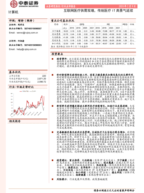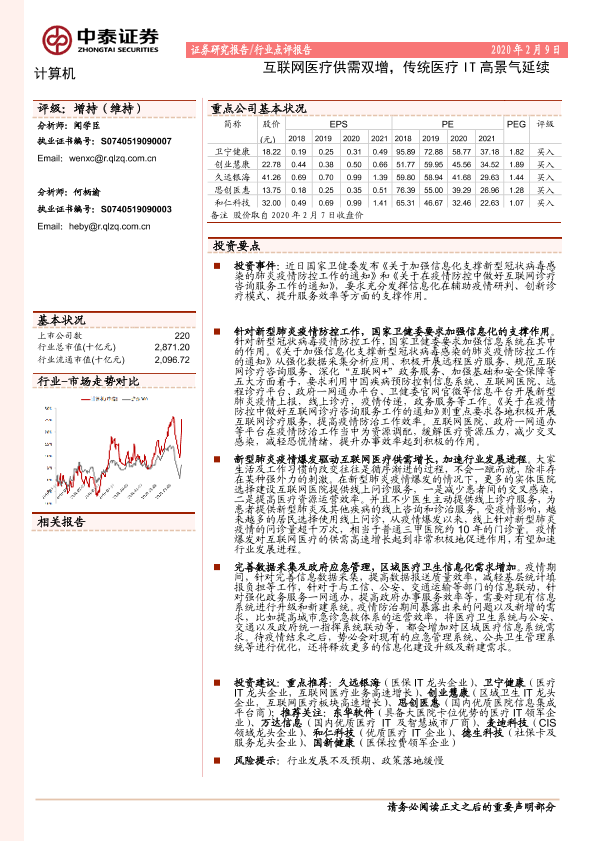 【中泰证券】【20200209】计算机:互联网医疗供需双增,传统医疗IT高景气延续-2页