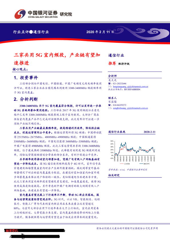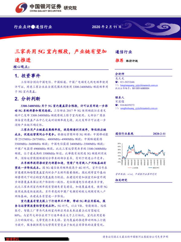 【银河证券】【20200211】通信行业:三家共用5G室内频段,产业链有望加速推进-4页