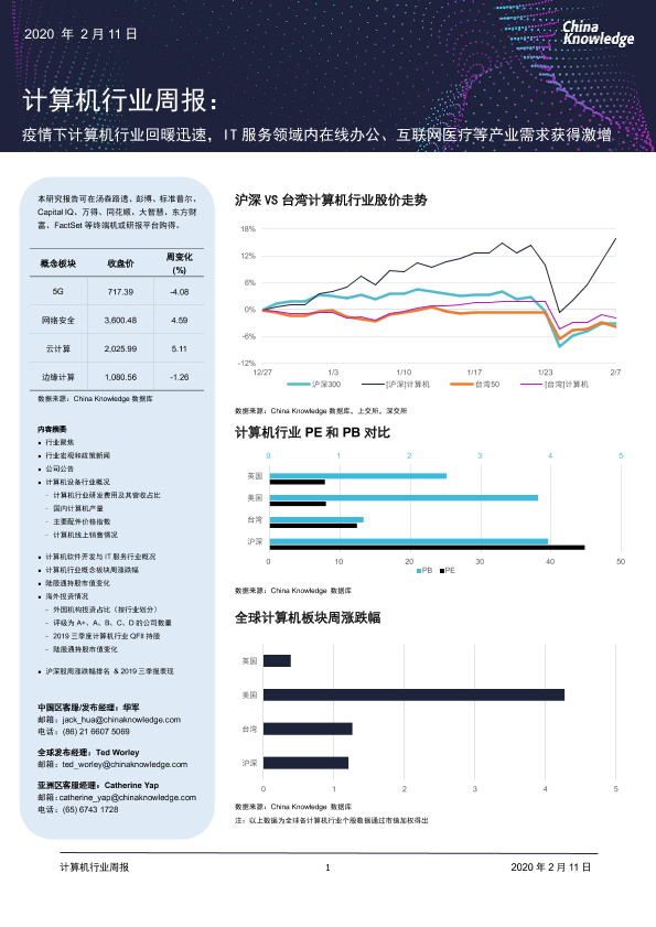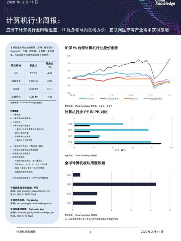 【China Knowledge】【20200211】20200211-China Knowledge-计算机行业周报:疫情下计算机行业回暖迅速,IT服务领域内在线办公、互联网医疗等产业需求获得激增-31页