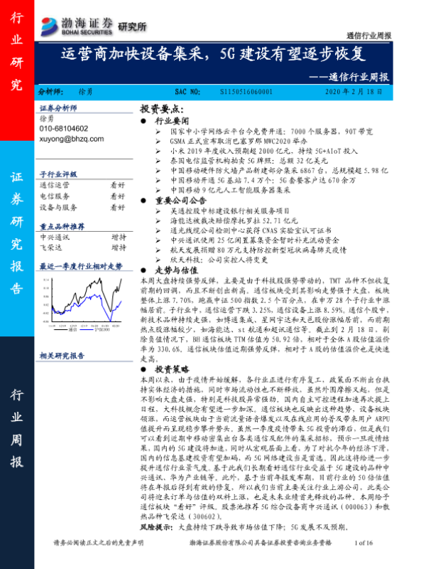 【渤海证券】【20200218】通信行业周报:运营商加快设备集采,5G建设有望逐步恢复-16页