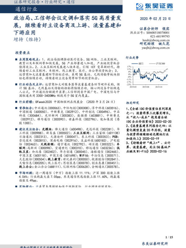 【东吴证券】【20200223】通信行业:政治局、工信部会议定调和落实5G高质量发展,继续看好主设备商及上游、流量基建和下游应用-15页