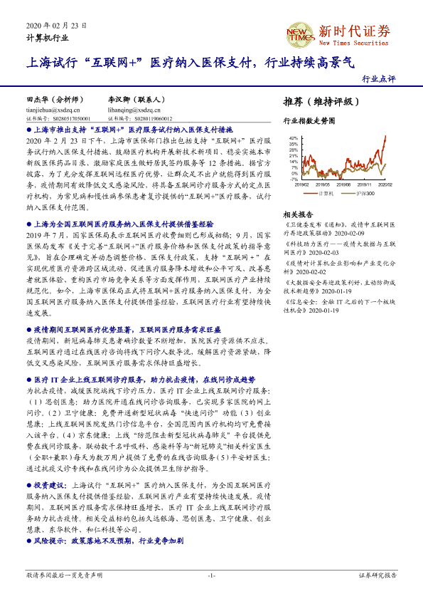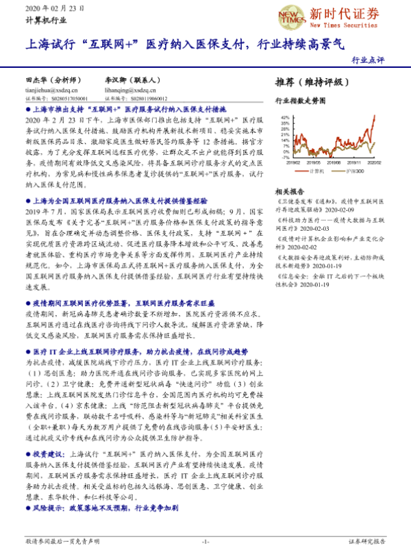 【新时代证券】【20200223】计算机行业:上海试行“互联网+”医疗纳入医保支付,行业持续高景气-3页