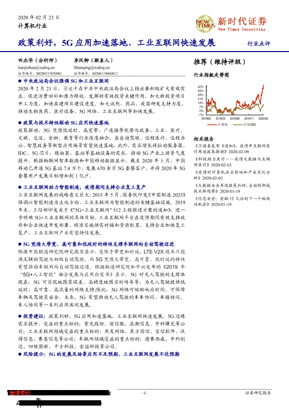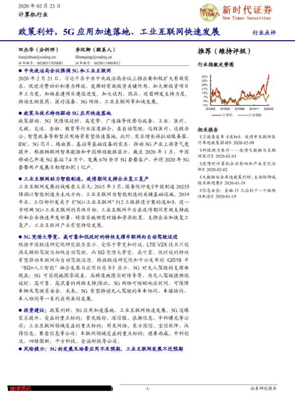 【新时代证券】【20200223】计算机行业:政策利好,5G应用加速落地、工业互联网快速发展 行业点评-3页
