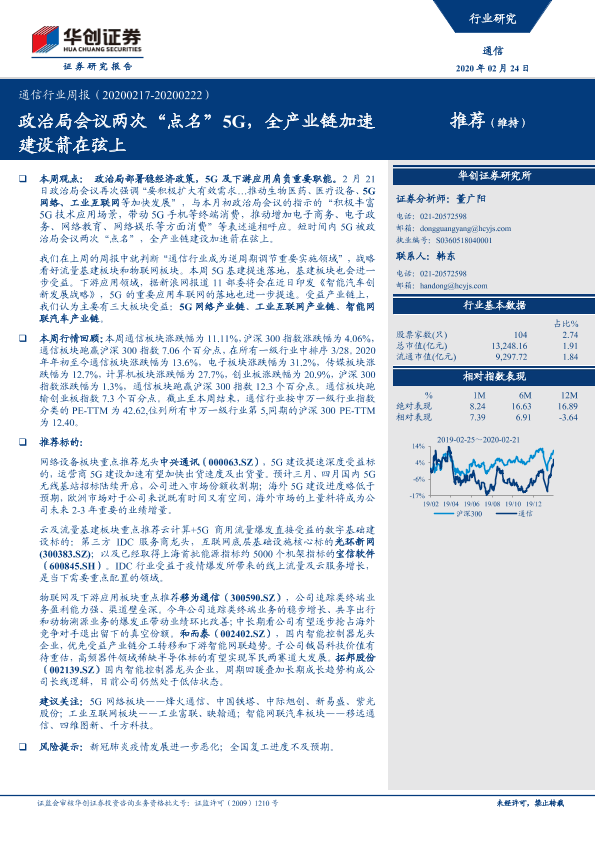 【华创证券】【20200224】通信行业周报:政治局会议两次“点名”5G,全产业链加速建设箭在弦上-18页