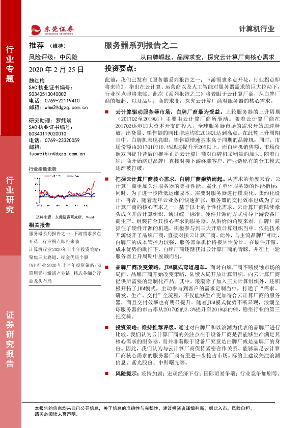 【东莞证券】【20200225】服务器系列报告之二:从白牌崛起、品牌求变,探究云计算厂商核心需求-14页