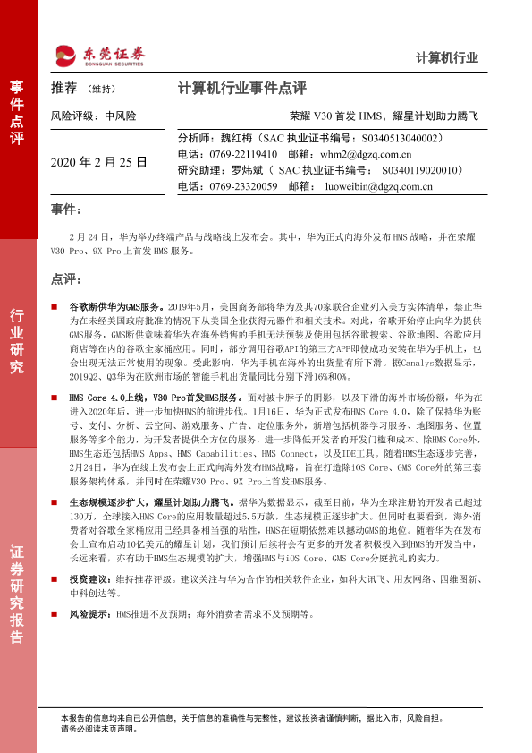 【东莞证券】【20200225】计算机行业事件点评:荣耀V30首发HMS,耀星计划助力腾飞-2页