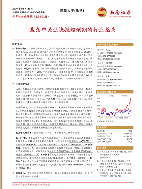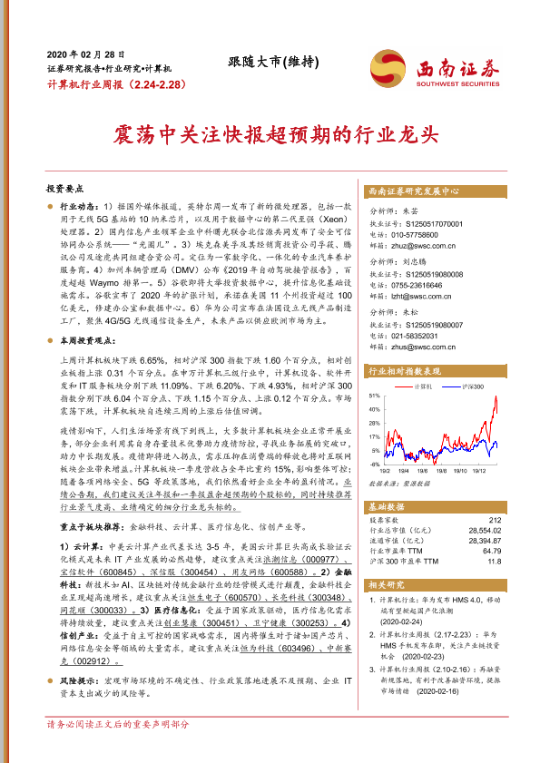 【西南证券】【20200228】计算机行业周报:震荡中关注快报超预期的行业龙头-15页