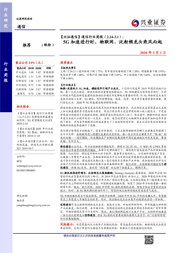 【兴业证券】【20200301】通信行业周报(2.24-3.1):5G加速进行时,物联网、泛射频龙头乘风而起-22页
