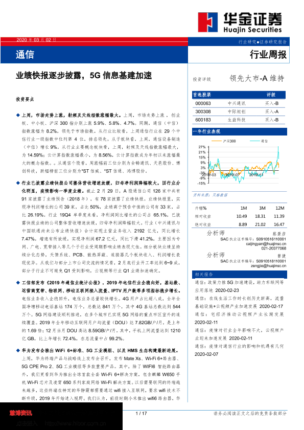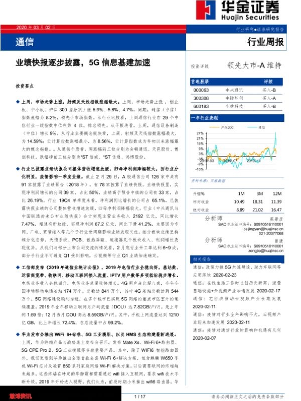 【华金证券】【20200302】20200302-华金证券-通信行业周报:业绩快报逐步披露,5G信息基建加速-17页