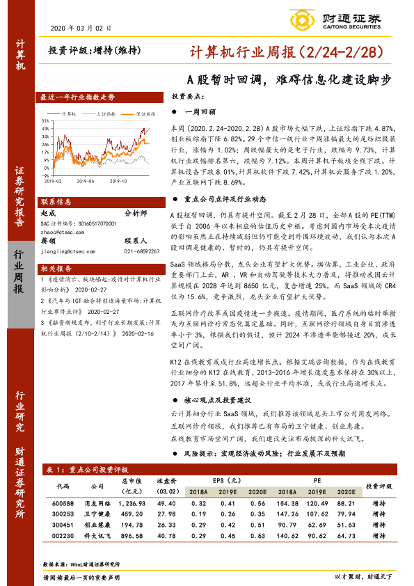 【财通证券】【20200302】20200302-财通证券-计算机行业周报:A股暂时回调,难碍信息化建设脚步-20页