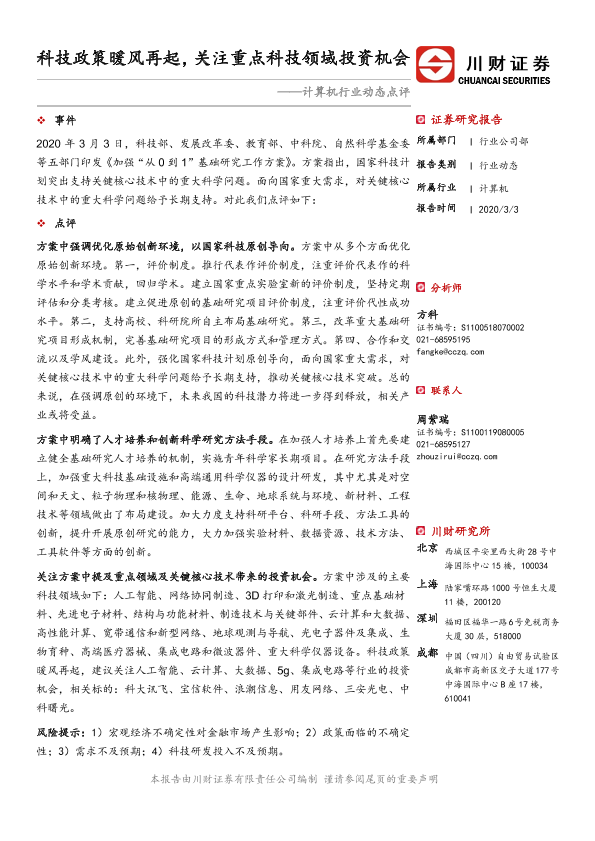 【川财证券】【20200303】计算机行业动态点评:科技政策暖风再起,关注重点科技领域投资机会-2页