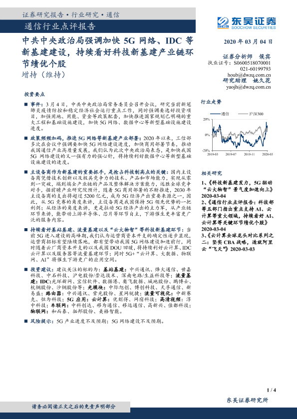 【东吴证券】【20200304】通信行业点评报告:中共中央政治局强调加快5G网络、IDC等新基建建设,持续看好科技新基建产业链环节绩优个股-4页