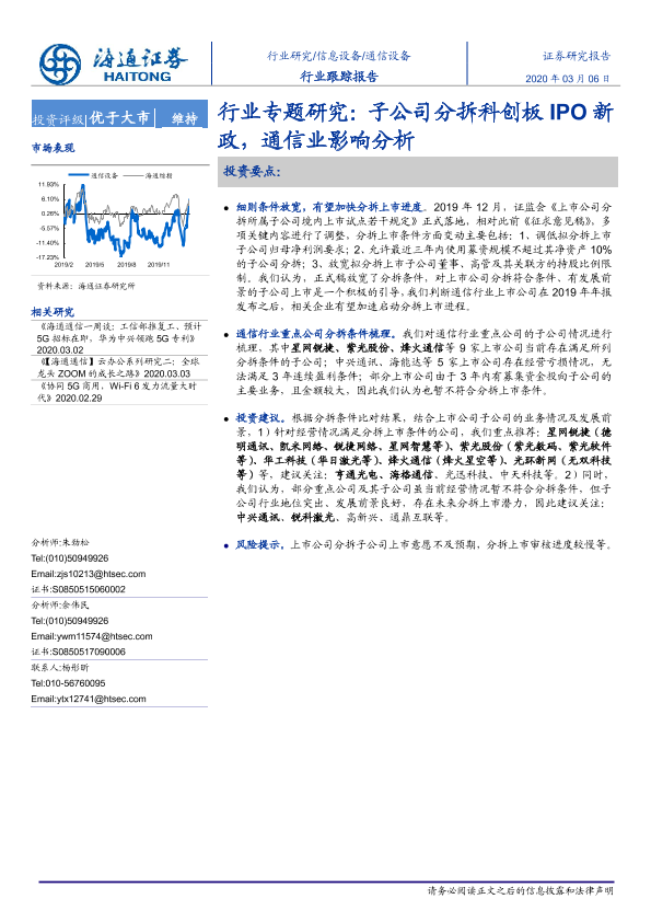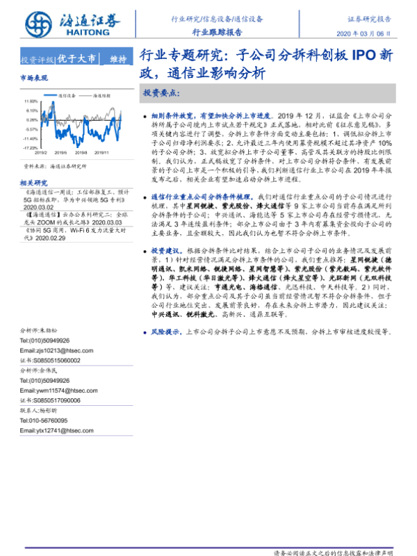 【海通证券】【20200306】通信设备行业专题研究:子公司分拆科创板IPO新政,通信业影响分析-9页