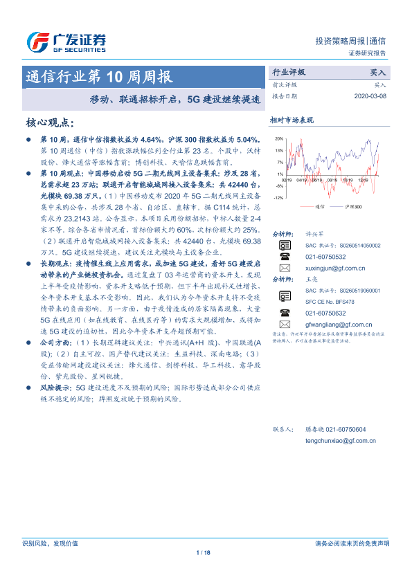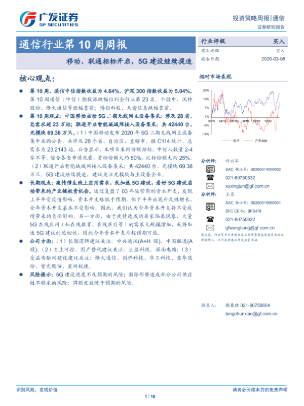 【广发证券】【20200308】20200308-广发证券-通信行业第10周周报:移动、联通招标开启,5G建设继续提速-18页