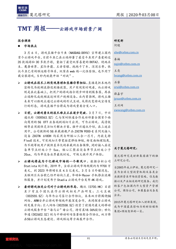 【莫尼塔研究】【20200308】TMT周报——云游戏市场前景广阔-10页