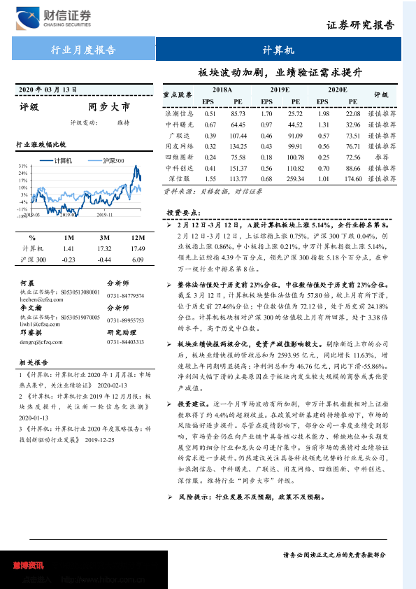【财信证券】【20200313】计算机行业月度报告:板块波动加剧,业绩验证需求提升-11页