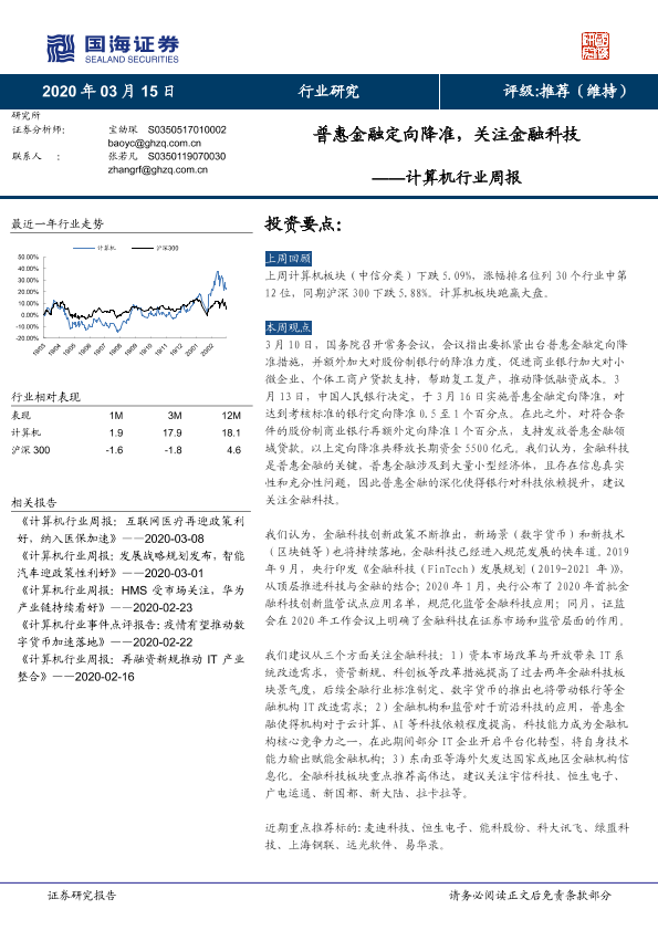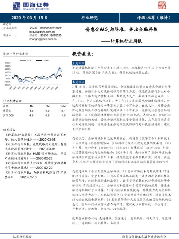 【国海证券】【20200315】计算机行业周报:普惠金融定向降准,关注金融科技-16页