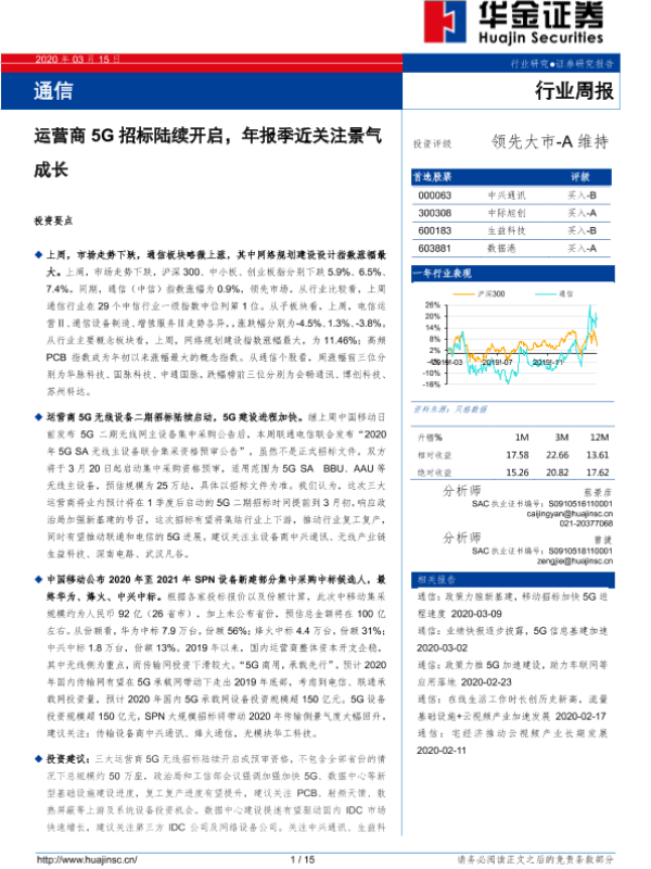 【华金证券】【20200315】通信行业周报:运营商5G招标陆续开启,年报季近关注景气成长-15页