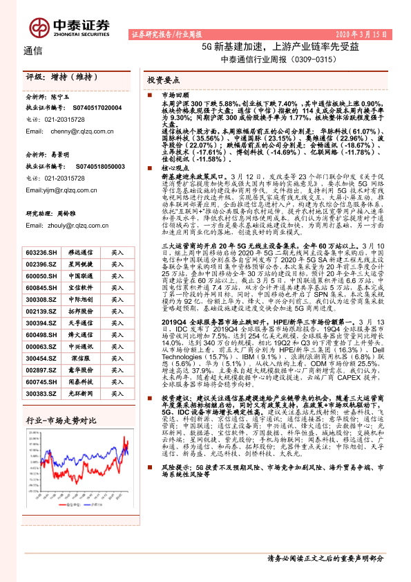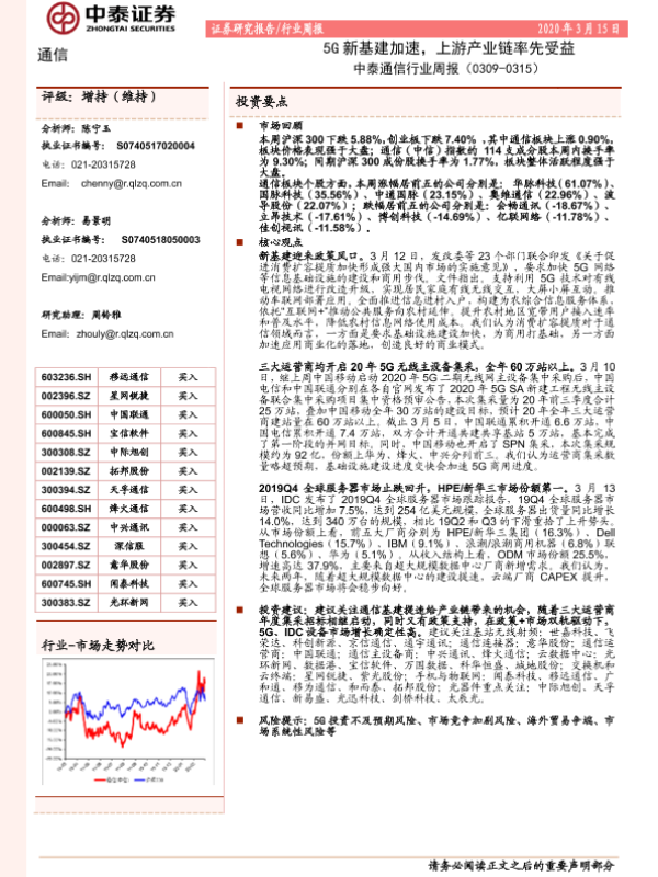 【中泰证券】【20200315】通信行业周报:5G新基建加速,上游产业链率先受益-14页