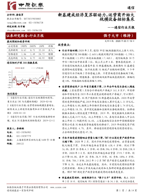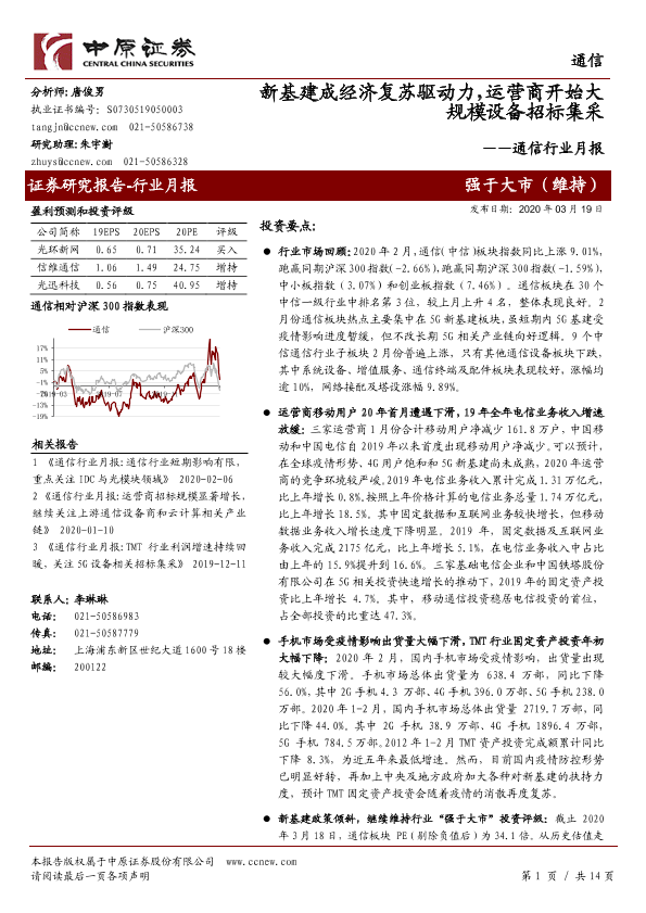 【中原证券】【20200319】通信行业月报:新基建成经济复苏驱动力,运营商开始大规模设备招标集采-14页
