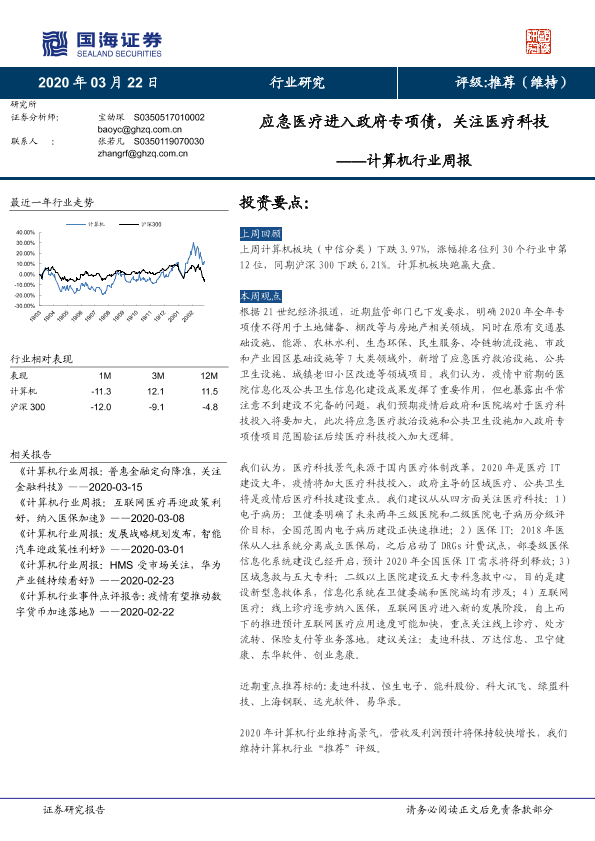 【国海证券】【20200322】计算机行业周报:应急医疗进入政府专项债,关注医疗科技-17页