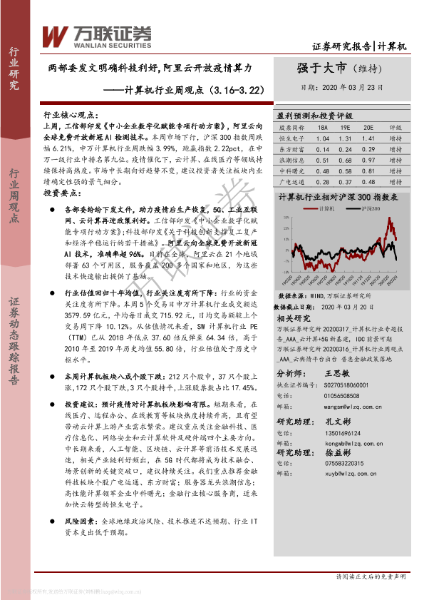 【万联证券】【20200323】计算机行业周观点:两部委发文明确科技利好,阿里云开放疫情算力-14页