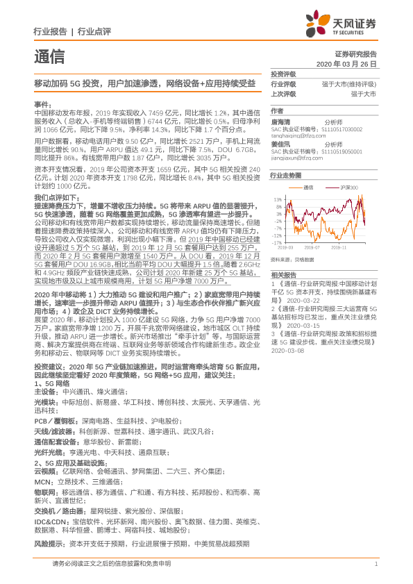 【天风证券】【20200326】通信:移动加码5G投资,用户加速渗透,网络设备+应用持续受益-9页
