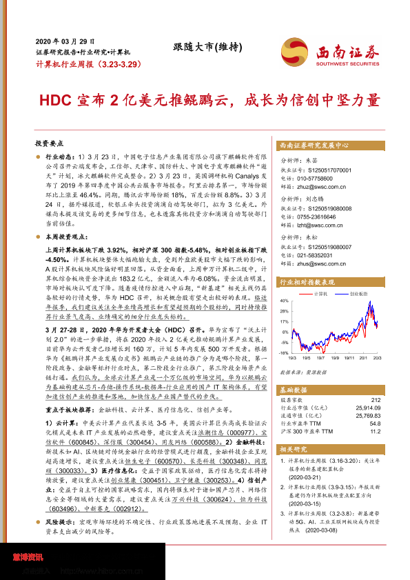 【西南证券】【20200329】计算机行业周报:HDC宣布2亿美元推鲲鹏云,成长为信创中坚力量-15页