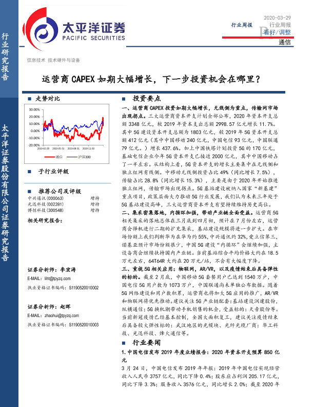 【太平洋证券】【20200329】通信行业周报:运营商CAPEX如期大幅增长,下一步投资机会在哪里?-13页