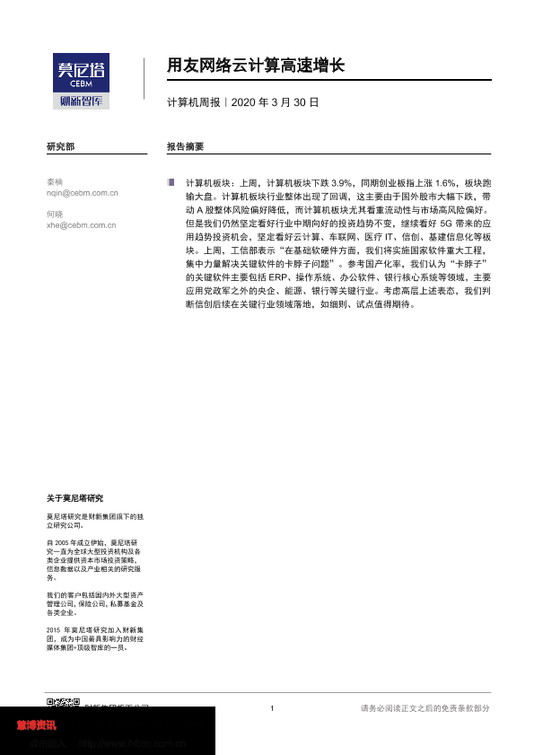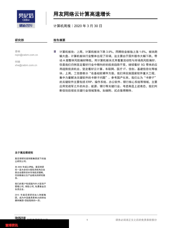 【莫尼塔研究】【20200330】计算机周报:用友网络云计算高速增长-7页