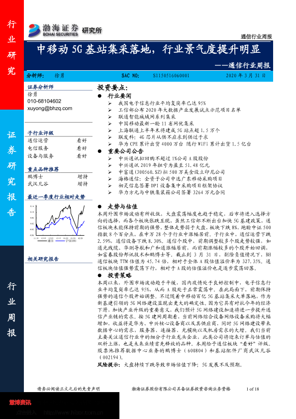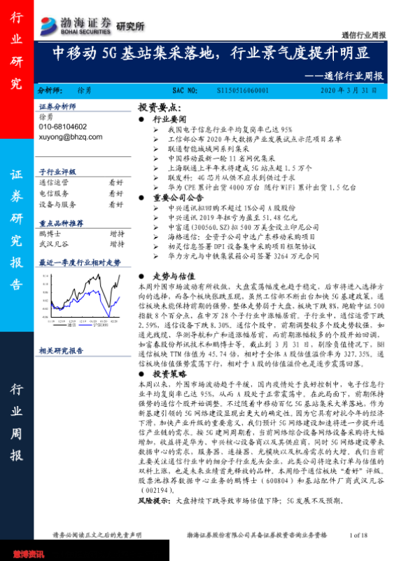 【渤海证券】【20200331】20200331-渤海证券-通信行业周报:中移动5G基站集采落地,行业景气度提升明显-18页