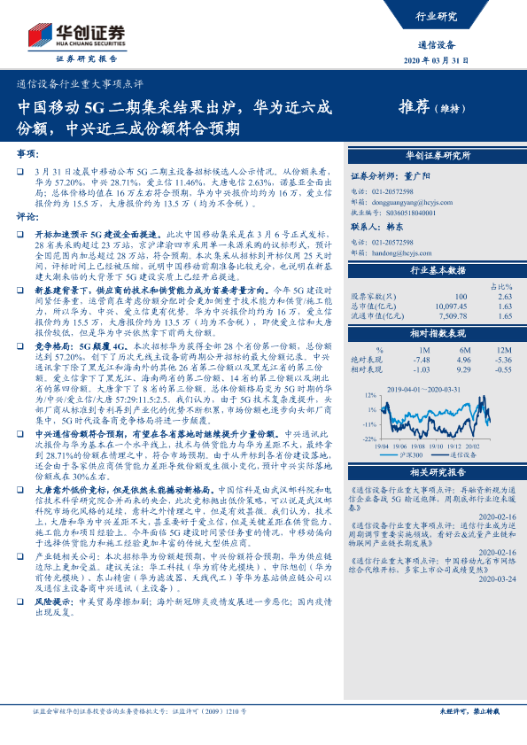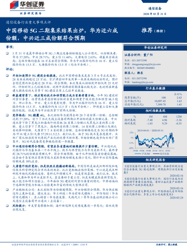 【华创证券】【20200331】通信设备行业重大事项点评:中国移动5G二期集采结果出炉,华为近六成份额,中兴近三成份额符合预期-5页