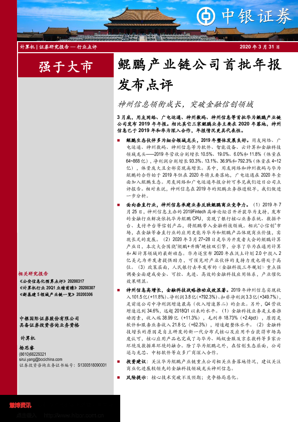 【中银证券】【20200331】计算机:鲲鹏产业链公司首批年报发布点评:神州信息领衔成长,突破金融信创领域-4页