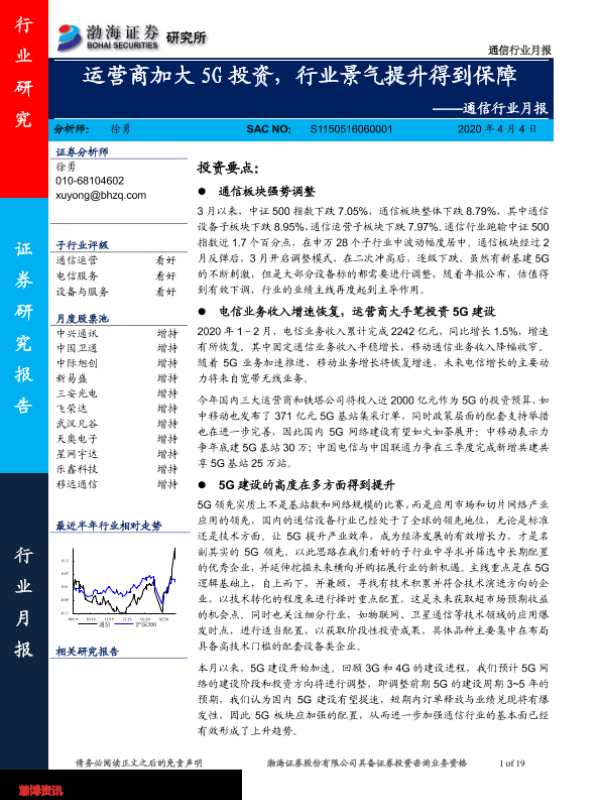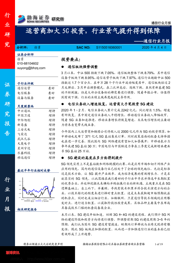 【渤海证券】【20200404】通信行业月报:运营商加大5G投资,行业景气提升得到保障-19页
