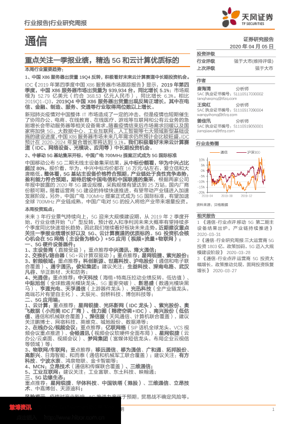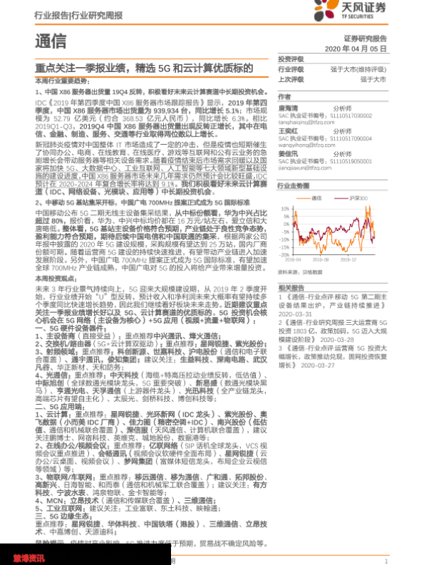 【天风证券】【20200405】通信行业研究周报:重点关注一季报业绩,精选5G和云计算优质标的-15页