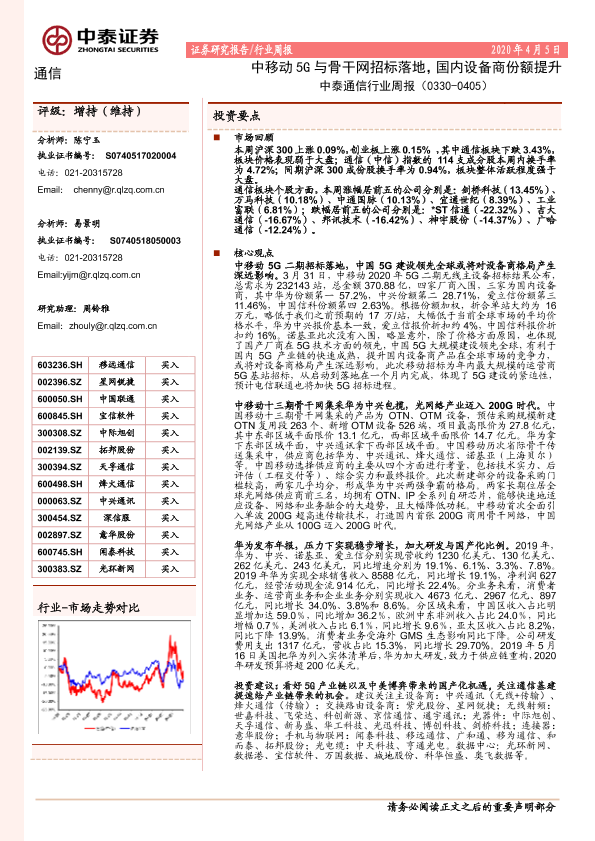 【中泰证券】【20200405】中泰通信行业周报:中移动5G与骨干网招标落地,国内设备商份额提升-19页