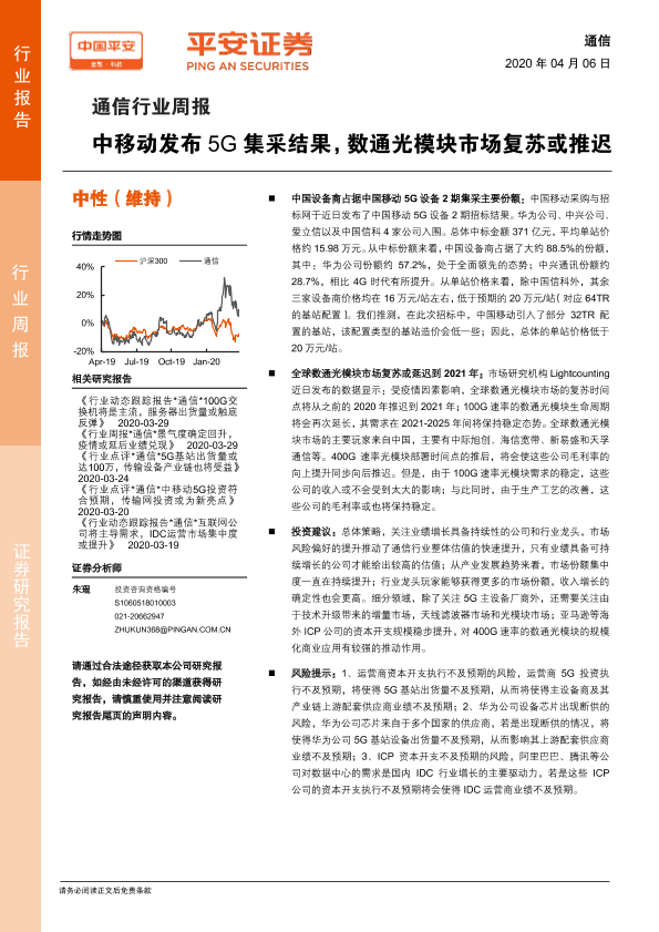 【平安证券】【20200406】20200406-平安证券-通信行业周报:中移动发布5G集采结果,数通光模块市场复苏或推迟-6页