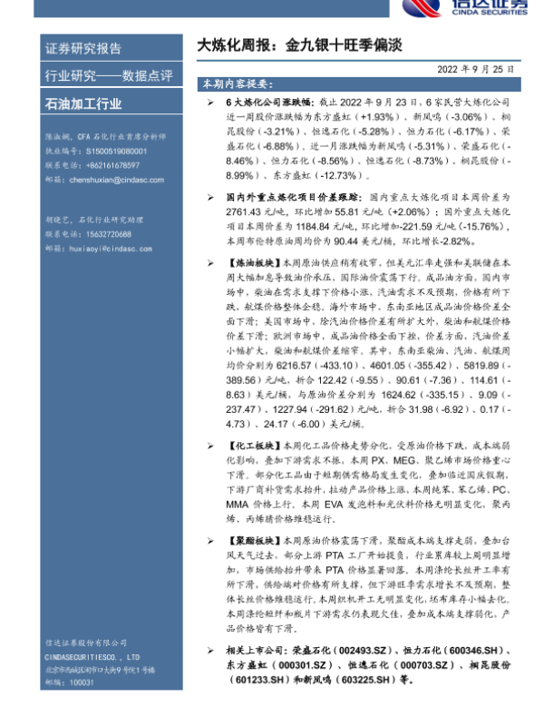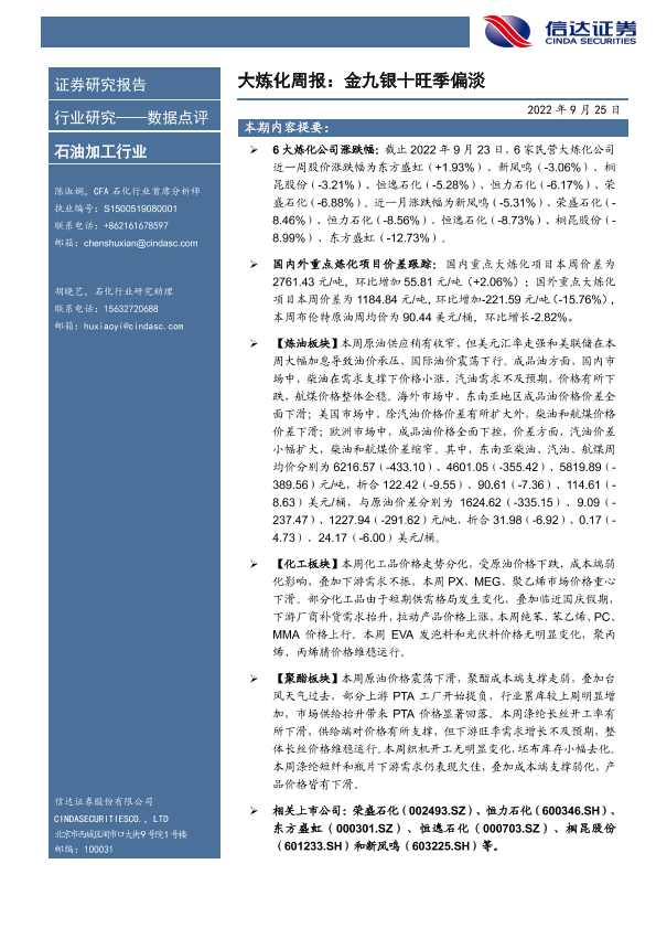 【信达证券】【20220925】2022石油加工行业大炼化周报:金九银十旺季偏淡-20页