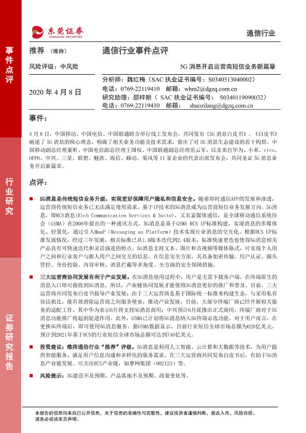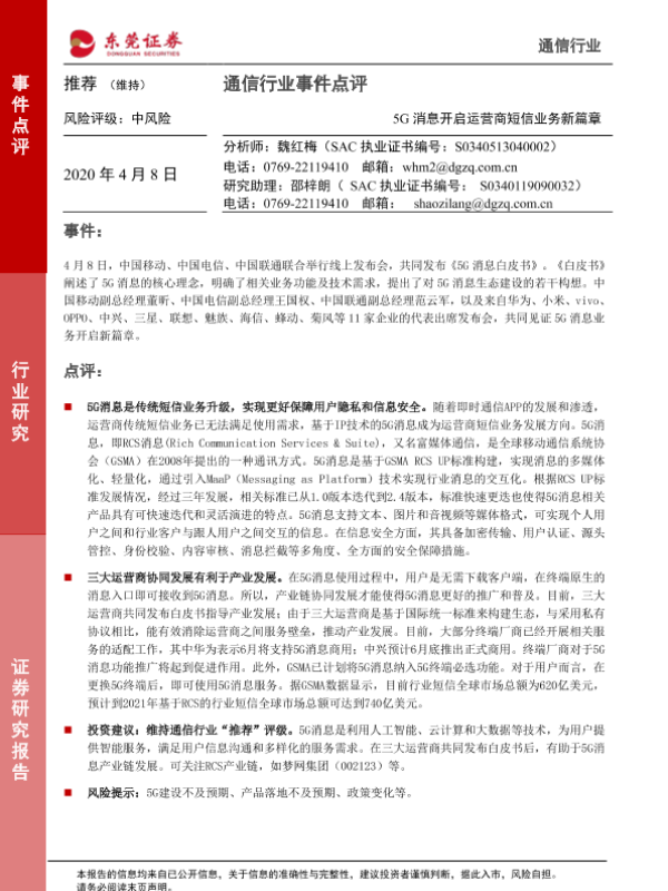 【东莞证券】【20200408】通信行业事件点评:5G消息开启运营商短信业务新篇章-2页