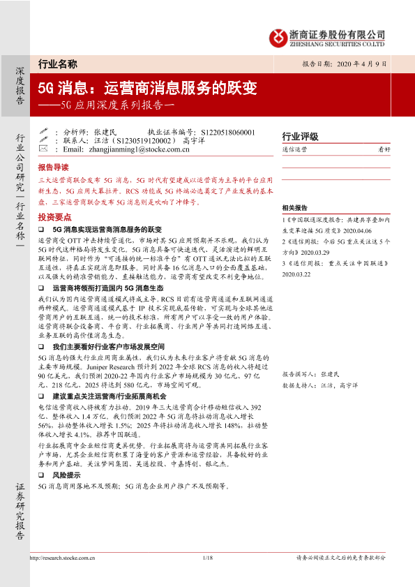 【浙商证券】【20200409】5G应用深度系列报告一:5G消息:运营商消息服务的跃变-18页