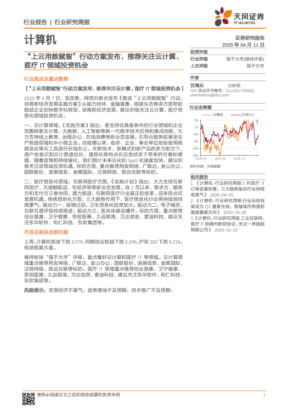 【天风证券】【20200411】计算机行业研究周报:“上云用数赋智”行动方案发布,推荐关注云计算、医疗IT领域投资机会-7页
