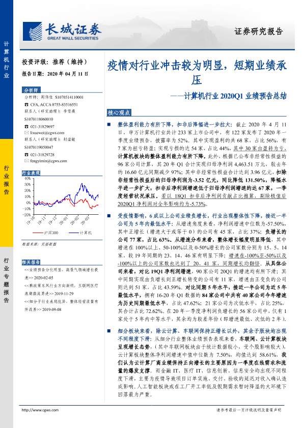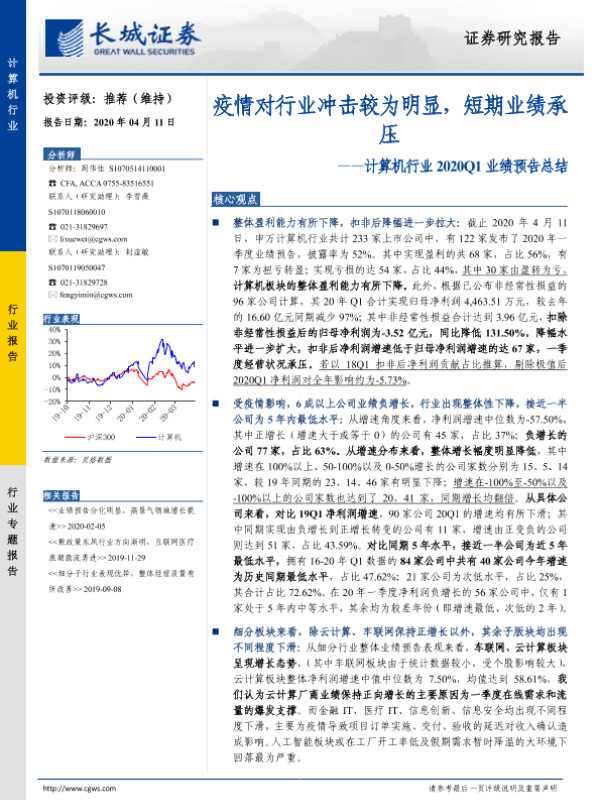 【长城证券】【20200411】计算机行业2020Q1业绩预告总结:疫情对行业冲击较为明显,短期业绩承压-14页