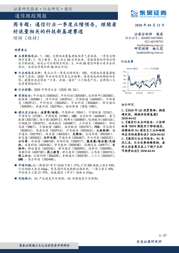 【东吴证券】【20200412】20200412-东吴证券-通信跟踪周报:周专题:通信行业一季度业绩预告,继续看好流量相关的科技新基建赛道-17页