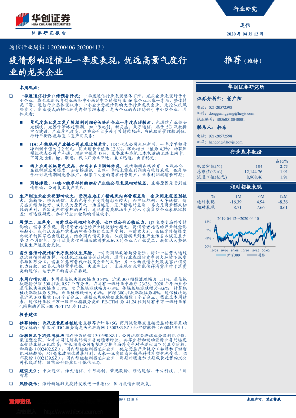 【华创证券】【20200412】20200412-华创证券-通信行业周报:疫情影响通信业一季度表现,优选高景气度行业的龙头企业-22页